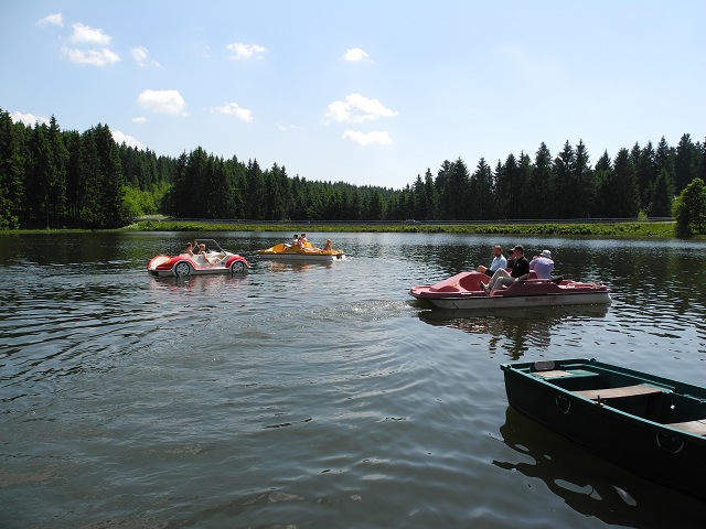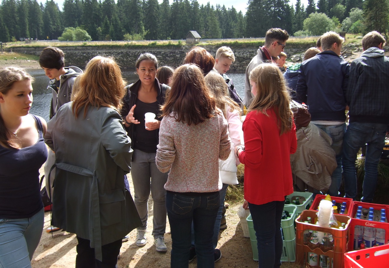 Die Schüler rauschten die Bobbahn in der schnellsten Geschwindigkeit hinunter, zu ihrem Kummer ausgebremst von den etwas ängstlicheren, meist älteren Teilnehmern unseres Ausflugs. Unsere Wanderung führte uns zur Stabkirche von Hahnenklee und es ging weiter über den Liebesbankweg an etlichen Oberharzer Teichen entlang, wo traumhafte Fotos entstanden, bis zum Auerhahn. Lediglich eine Kleingruppe, bestehend aus 2 Lehrern und 2 Schülerinnen wollte unbedingt längere Zeit die Natur genießen und bog auf unbekannte Pfade ab. Auch diese Irrläufer konnten aber wieder eingesammelt werden. Es gibt eben zu viele Teiche bei Hahnenklee.