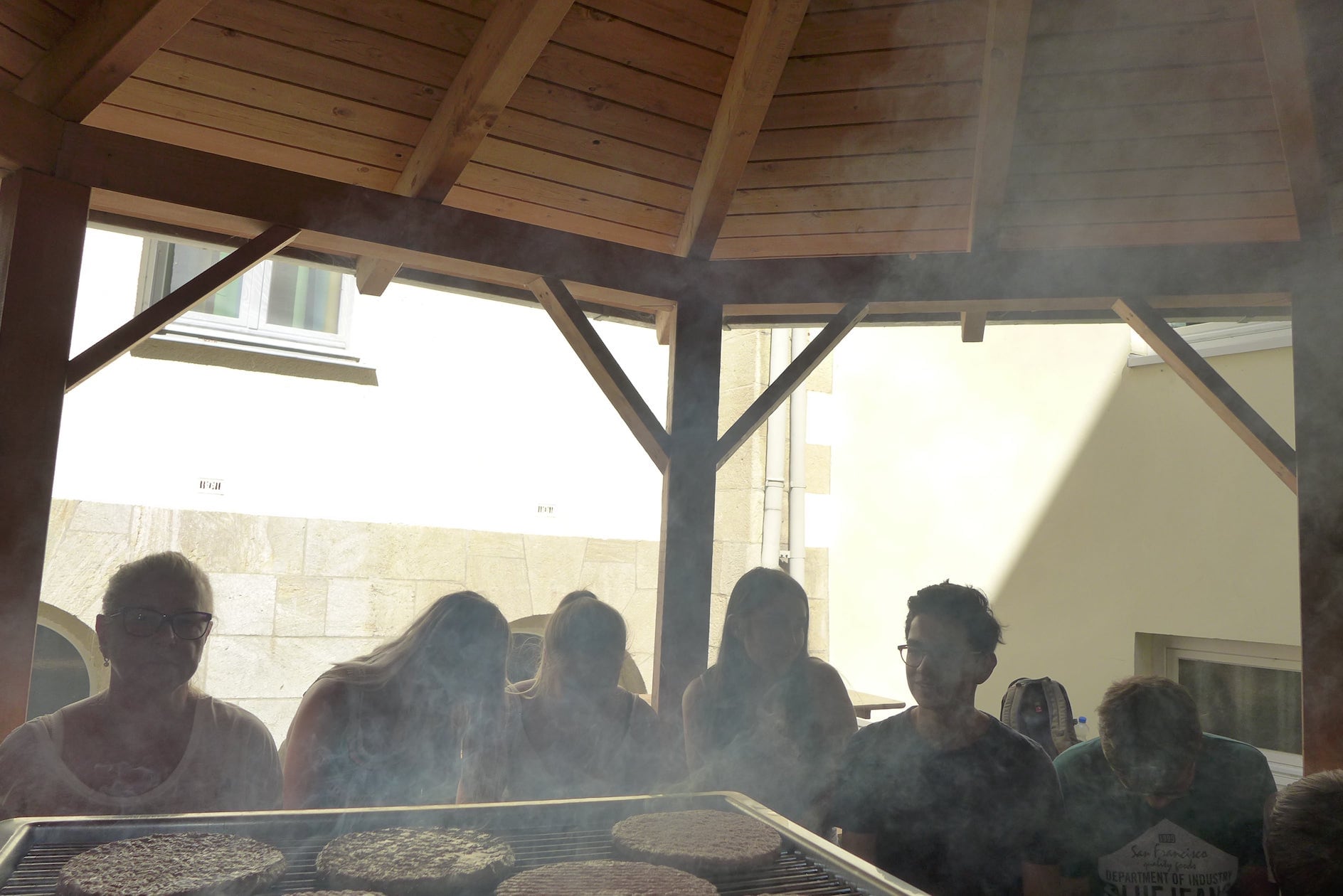 Zurück am NIG fassten viele mit an, um alles für das Grillen aufzubauen. Ein besonderer Dank gilt hier Herrn Weber und Herrn Hankel, die trotz der Hitze am Grill ausharrten und die Burger kompetent betreuten!