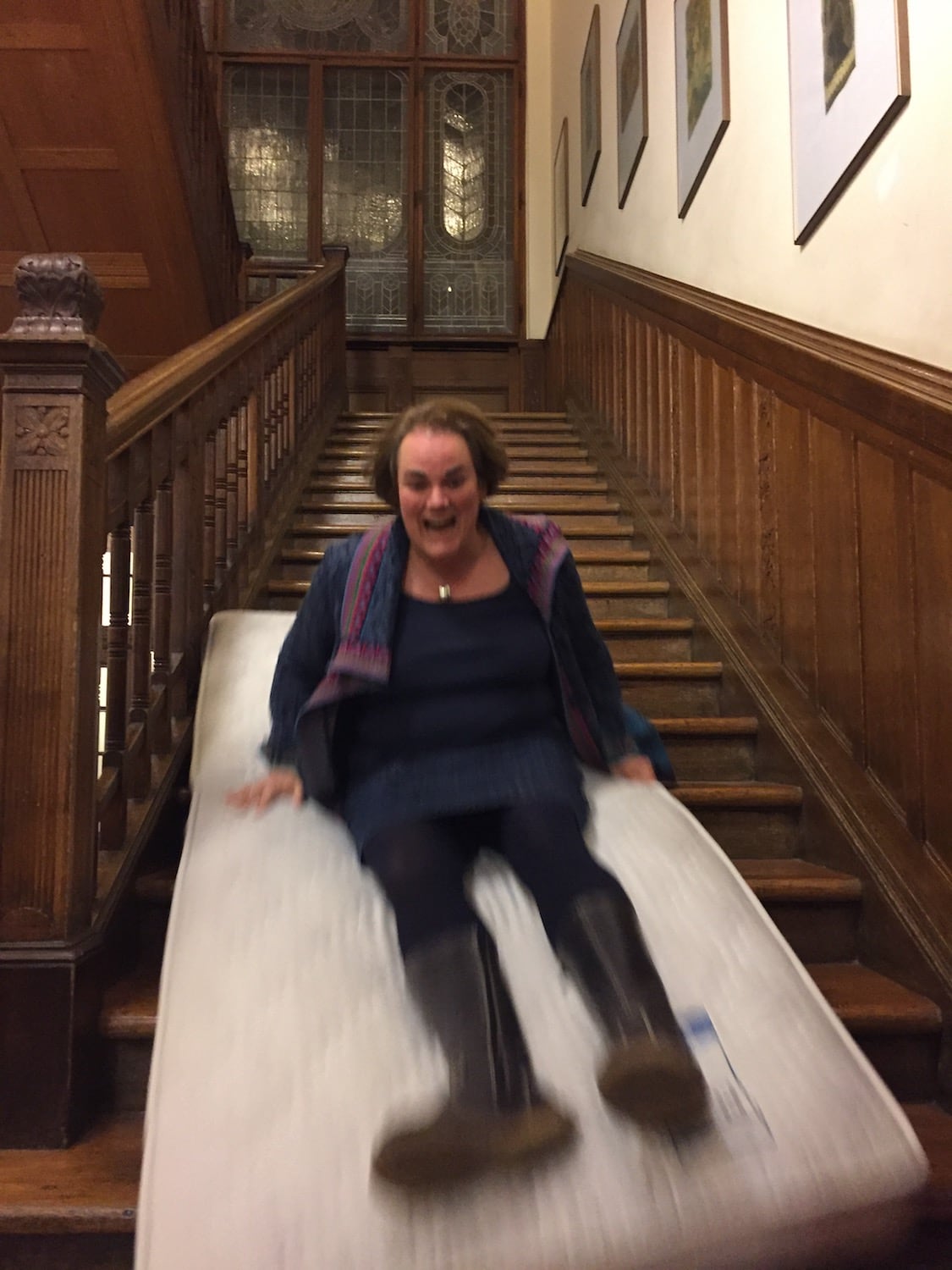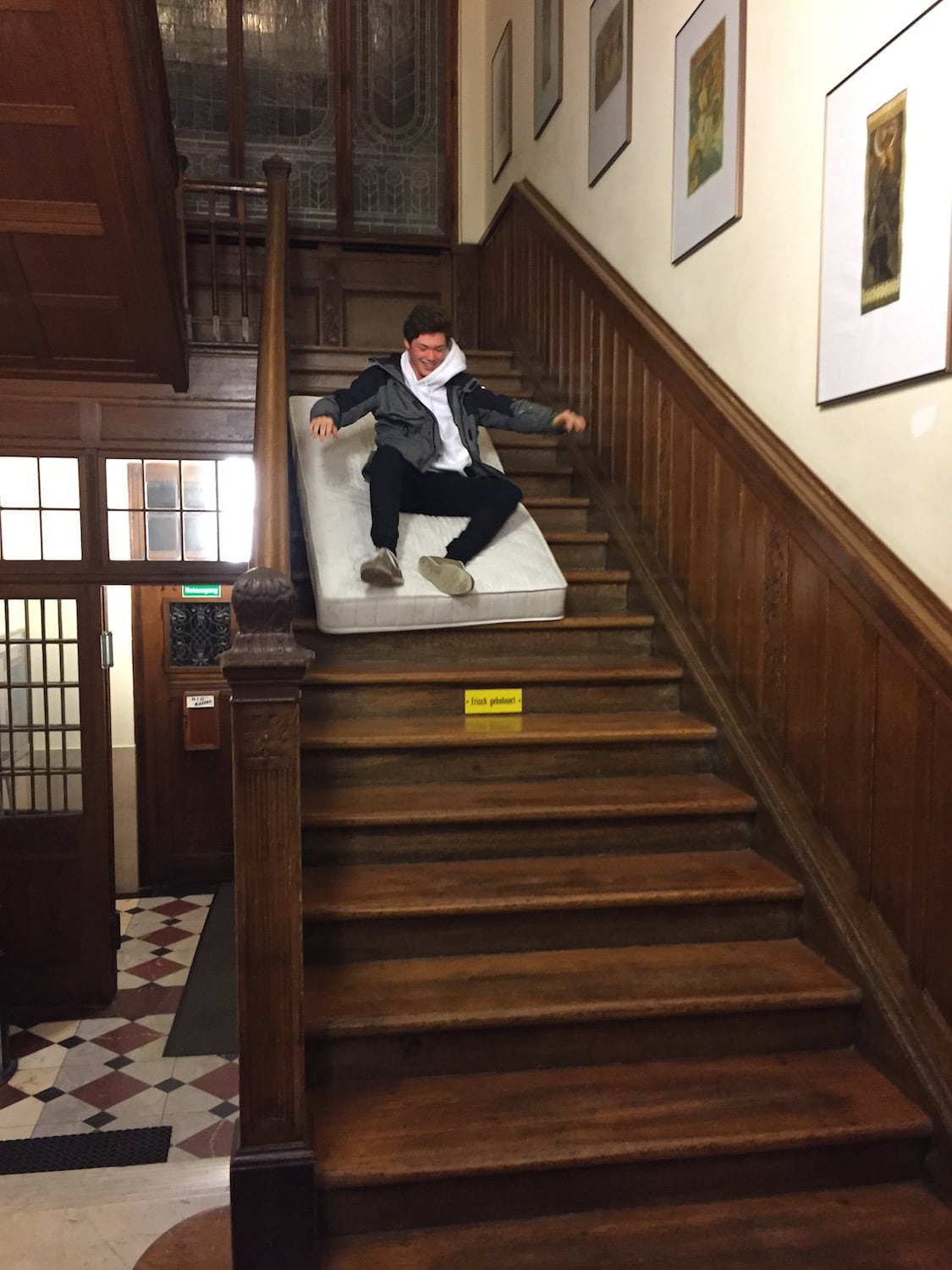So fand am Dienstag, dem 17. Dezember 2018 der erste internatsinterne Matratzen-Rutsch-Contest statt. Bei reger Beteiligung ging es lautstark und mit viel Spaß die Haupthaus-Treppen hinunter. Für die Sicherheit stand unser Internats-Sanitäter an der Strecke: Danke, Lucas!