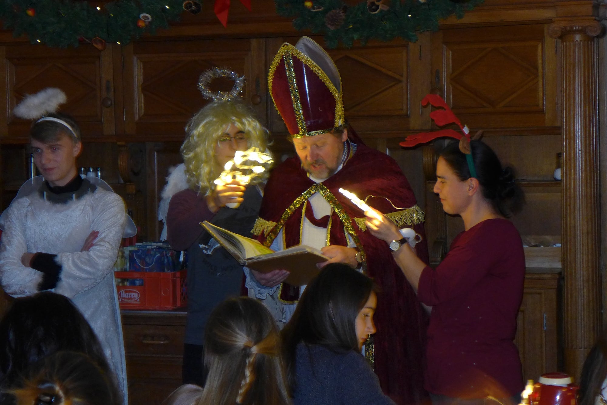 In diesem Jahr gab es nach dem Genuss von Schokolade und Co. sogar Besuch vom Heiligen Nikolaus, Knecht Ruprecht und einem Weihnachtsengel, die sich freundlicherweise bereit erklärt hatten, die Wichtelgeschenke und das Geschenk vom Internat zu verteilen.