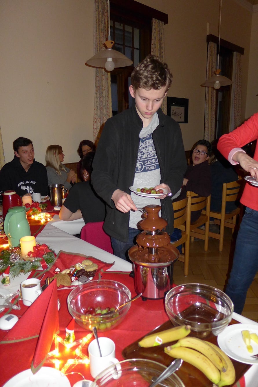Beim traditionellen Nikolauskaffe im Internat saßen die Bewohner*innen des Internats gemeinsam mit Heimmüttern und betreuenden Lehrern auch in diesem Jahr bei Kaffee, Tee, Kakao, Keksen in gemütlicher Runde beisammen. Am Schoko-Brunnen wurden Früchte mit Scholade überzogen. Im lockeren Gespräch saß man beieinander. Einige weihnachtliche Lieder sorgten für eine gute Atmosphäre.